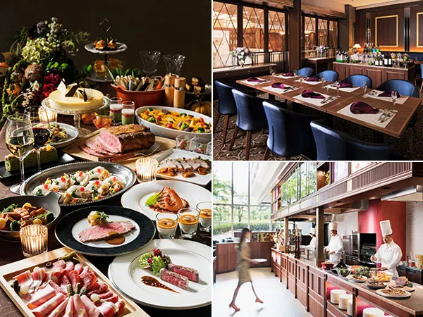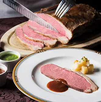 ディナーでは、“隠れた人気メニュー”ビーフシチューにチーズをのせて炙る「牛肉の煮込みと茸のフリカッセ」が登場。海老の旨味が凝縮したビスク風ソースがそそる「オマール海老のグリエと帆立貝柱」はおすすめのひと皿です。さらに、その場で切り出し&チーズを削る演出付きの「シャルキュトリー」のオードブル、お好みのソースや岩塩などの調味料(8種)がトッピングできる人気の「ローストビーフ」をご用意します。