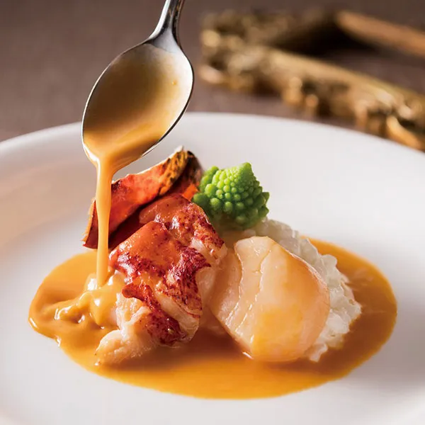 海老の旨味たっぷりのビスク風ソースに、オマール海老・帆立貝柱のグリエを添えて。ワインとのマリアージュがおすすめです。