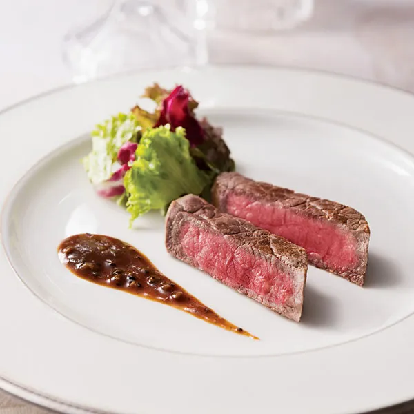 ステーキの旨味を引き出す、フォンドヴォーベースのトリュフ入りソースと味わう、ランチの人気メニュー。