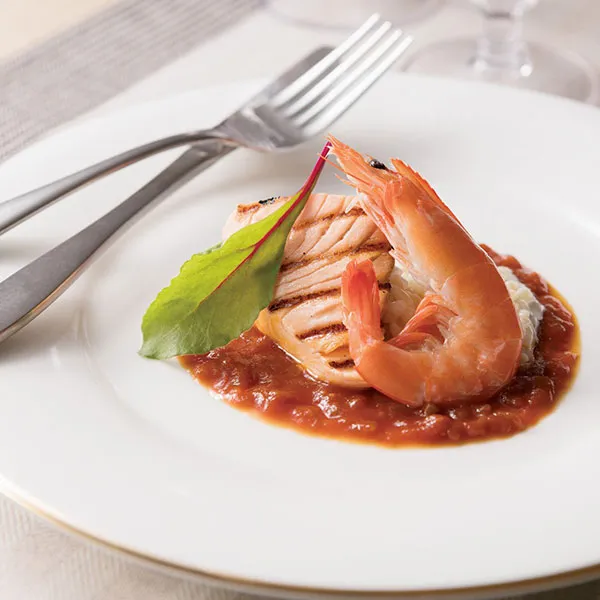 マリネサーモンと海老のグリエ チーズ風味のリゾーニを添えて