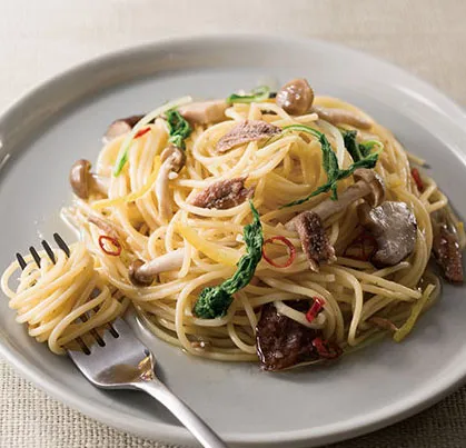 ひと皿ずつ出来たてをご用意。松茸の香りが秋らしい茸のペペロンチーノは、程よい塩気のアンチョビがアクセント。
