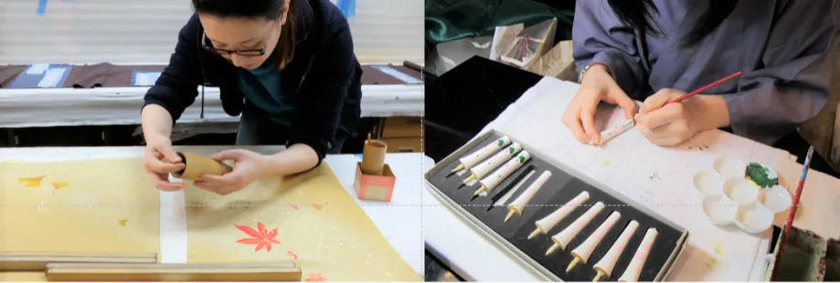 女性三人による京友禅ユニット「Soin」による「京友禅制作体験」。京友禅は精巧な柄を一枚一枚、人の手で染めることが特徴的です。