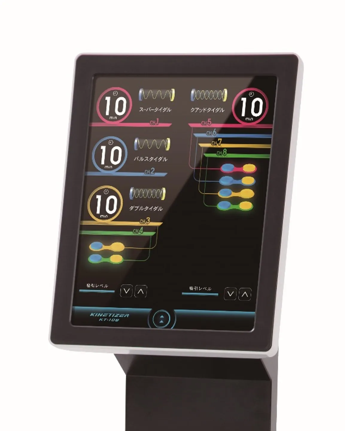先進機能を搭載したカイネタイザー「KTシリーズ」は、同時に複数部位の治療、または同時に多人数の治療に対応する8チャンネル仕様のKT-108とコンパクトなボディで対面治療時の操作性を追求した4チャンネル仕様のKT-104をラインナップ。保温性に優れた新型導子をはじめ患者さまの快適さを追求した数々の工夫と、オペレーターの負担を軽減する各種機能を搭載した先進の低周波治療器、それがカイネタイザーです。