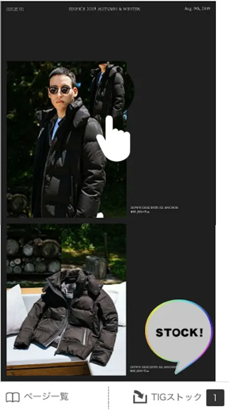デジタルマガジンの「TIG magazine」をめくって、「EDIFICE 2019 AUTUMN&WINTER」の最新コーディネートをチェックできるだけではなく、気になったアイテムを"さわる”だけでアイコンが画面下側のTIGストックに格納され、さらに、格納されたアイコンをタップするだけでそのアイテムの詳細情報へと遷移できるようになります。また、TIGストックしたアイテムをBAYCREW'S STOREより、直接、購入したり、予約することも可能です。
