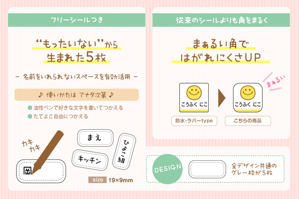 お名前を入れることができないスペースを利用し、手書きで書き込んでつかえる「フリースペース」を5枚おつけしました。「もったいない」という想いからできあがったシールです。