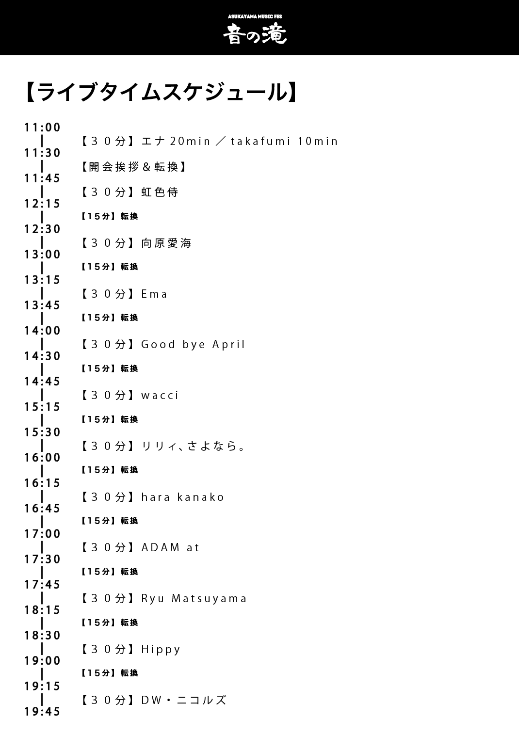 ADAM at、Ema、GOOD BYE APRIL、D.W.ニコルズ、虹色侍、hara kanako、HIPPY、向原愛海、リリィ、さよなら。、Ryu Matsuyama、wacci、(Opening Act/エナ、takafumi)