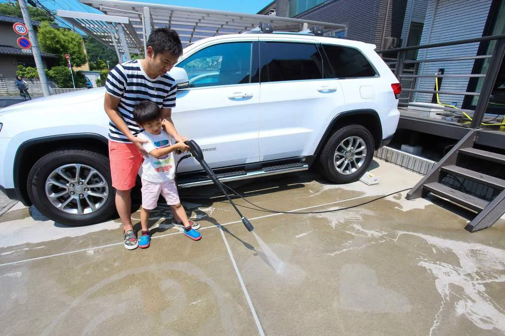 高圧洗浄機で駐車場にお絵かきしながら楽しくキレイに