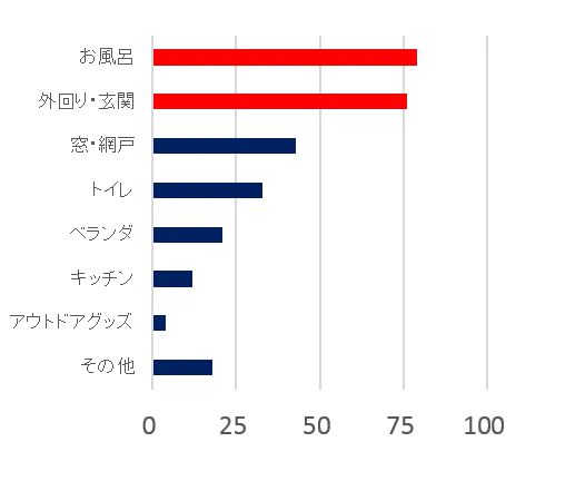 掃除してみたい場所は「キッチン」、「お風呂」の水回りや、
