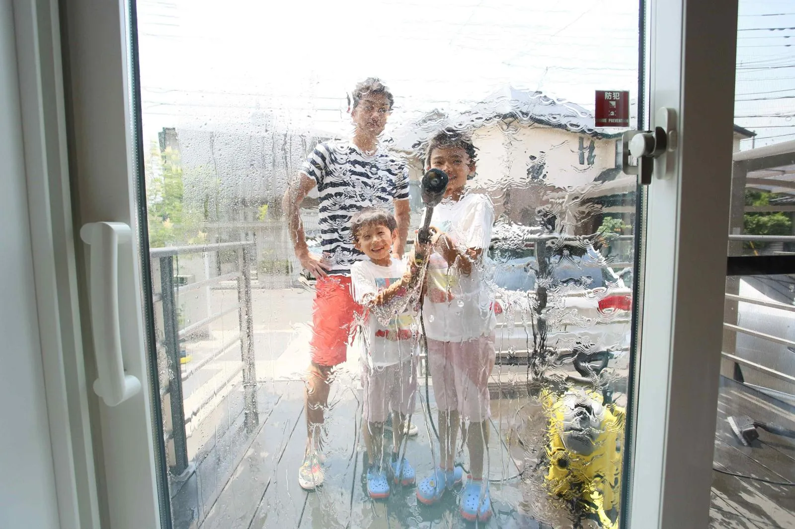 まずは窓掃除!汚れを水で吹き飛ばします。はじめての高圧洗浄機に「ゲームみたい!」と子供たちも楽しそう。