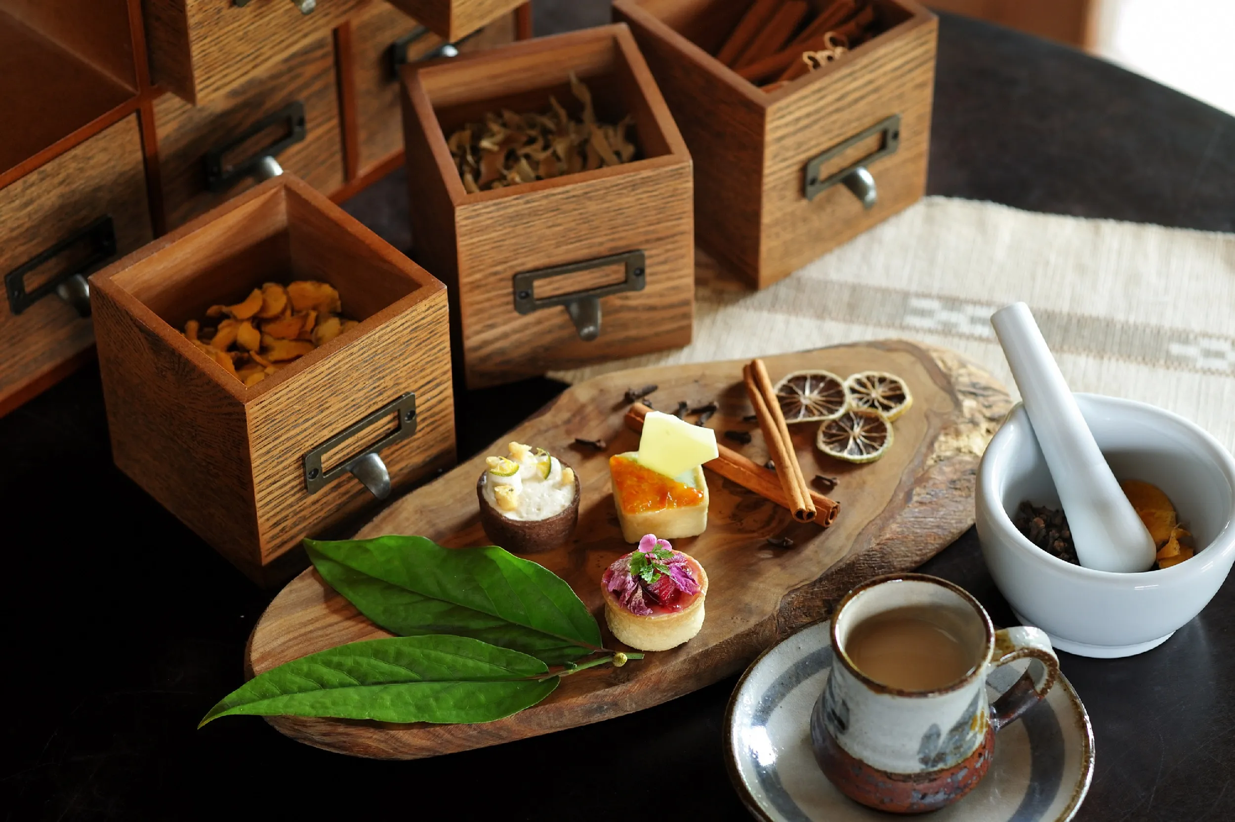 チェックイン後に客室に用意するのは、命草を使用したチャイとタルトです。チャイは、ピーヤシや月桃、ウコンなどの命草を調合し、茶葉と牛乳を一緒に煮出して作ります。タルトは、爽やかな辛みのピーヤシ、華やかな色合いと香りが特徴のコウシンバラ、柑橘系の爽やかな酸味がアクセントの長命草の3種です。スパイスの効いた温かなチャイとやさしい甘みのタルトで、身も心もほっこりと温まります。
