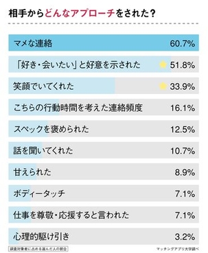 ランキング上位の結果は、自衛隊員から受けたアプローチと同じで1位「マメな連絡(67.9%)」「好き・会いたいと好意を示す(57.1%)」でした。