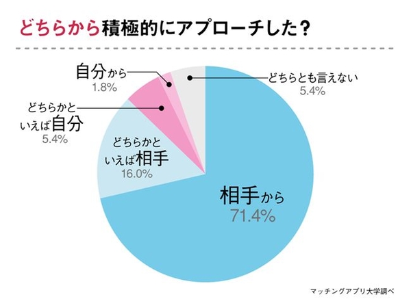 1位が「相手から(71.4%)」でした。「どちらかといえば相手から(16%)」を足すと、87.4%もの女性が相手(自衛隊員)からのアプローチを受けていることがわかりました。自衛隊の男性は、出会いの場である飲み会に繰り出して、気に入った女性には積極的に自分からアプローチをすることが多いんですね。