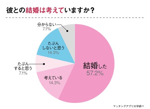 今回アンケートに答えてくださった56名の女性のうち、25%にあたる14名は現在も交際を継続中でした。そこで結婚の可能性について聞いてみました。