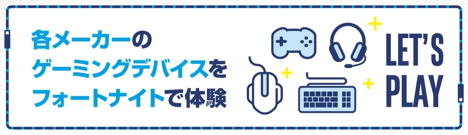 【1】1各社ゲーミングデバイスを展示するだけでなく全ブースにて実際にゲーミングPC LEVEL∞(レベル インフィニティ) を使用して『フォートナイト』をプレイする環境をご用意しますので、気になるゲーミングデバイスを体験したり、各デバイスメーカーのゲーミングデバイスの中からご自身にあった環境を探すことができます。また、ゲーミングデバイスでゲーム操作をしたことがない初めての方も歓迎ですので、ぜひお気軽にご参加ください。