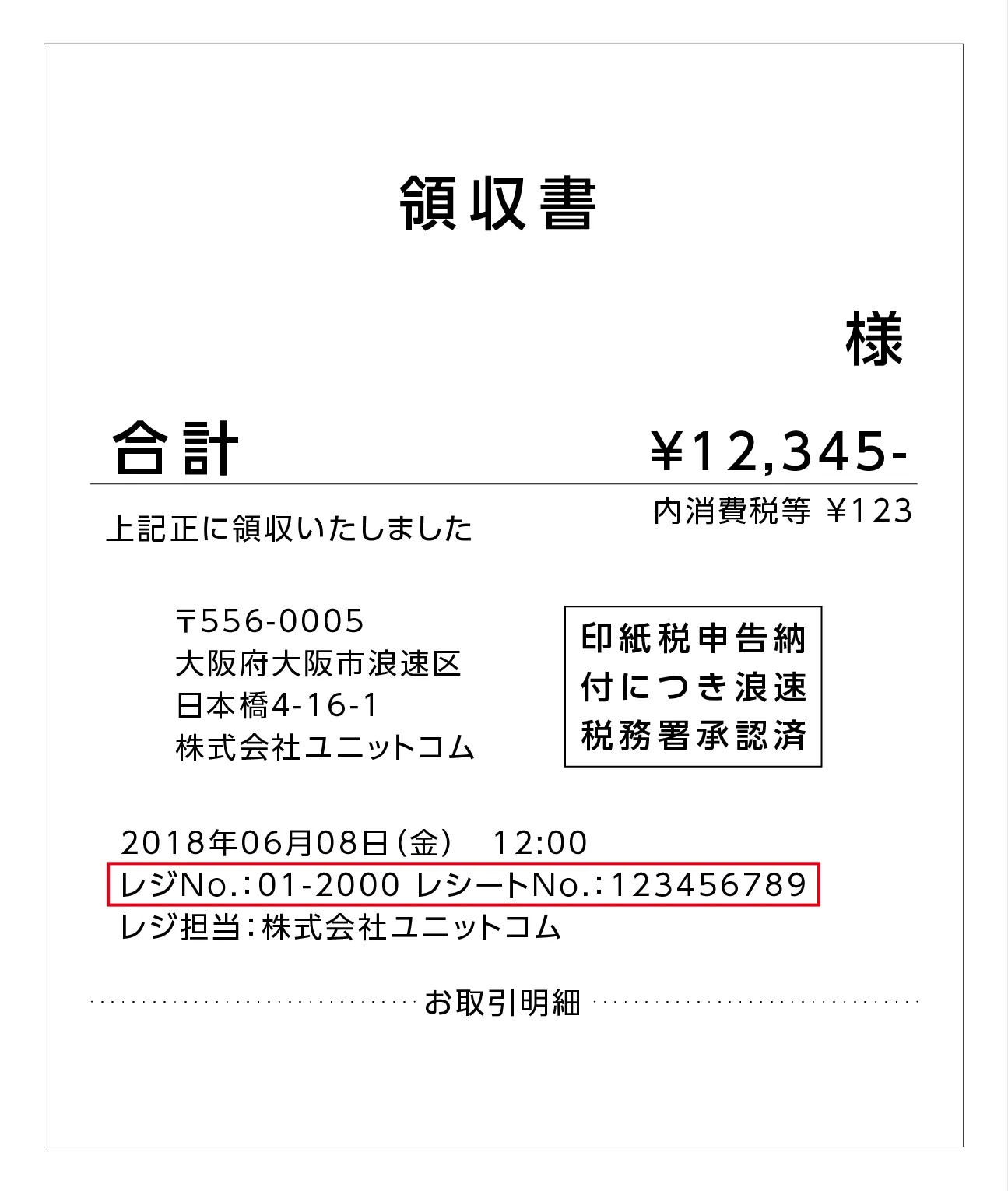 店舗で購入の場合:購入レシートに記載のあるレジNo.とレシートNo.