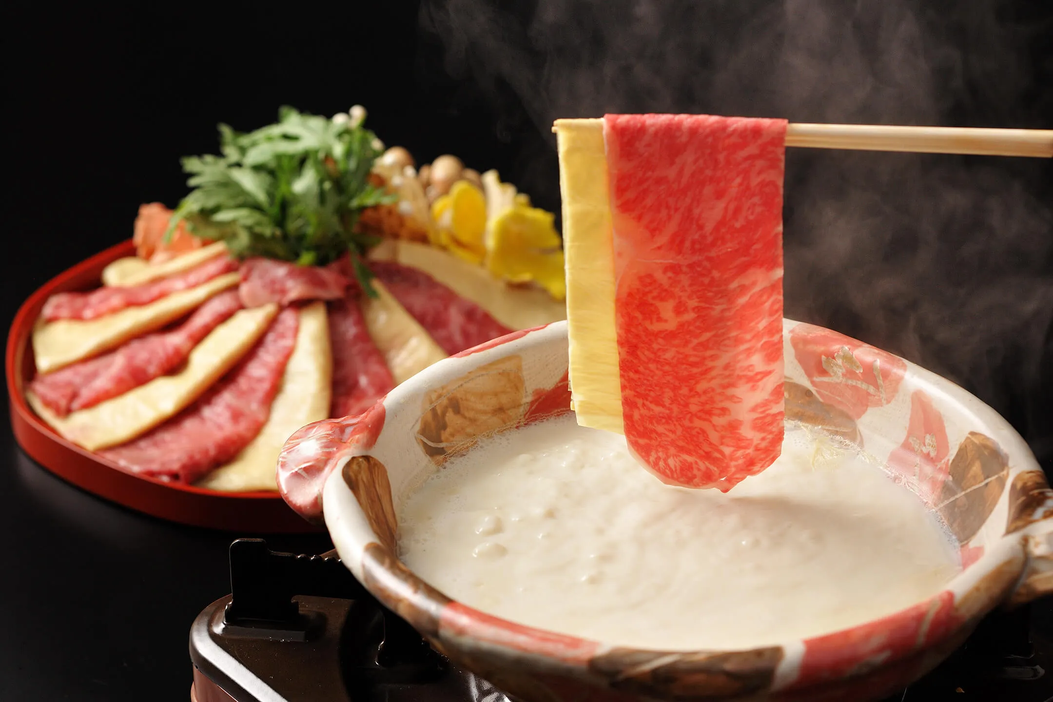 湯波と和牛をミルフィーユ状に並べ、色とりどりの野菜を添えました。まろやかな豆乳と出汁を合わせた、やさしい味わいは、世代を問わず親しまれます。鍋を華やかに彩る盛り付けにも注目です。