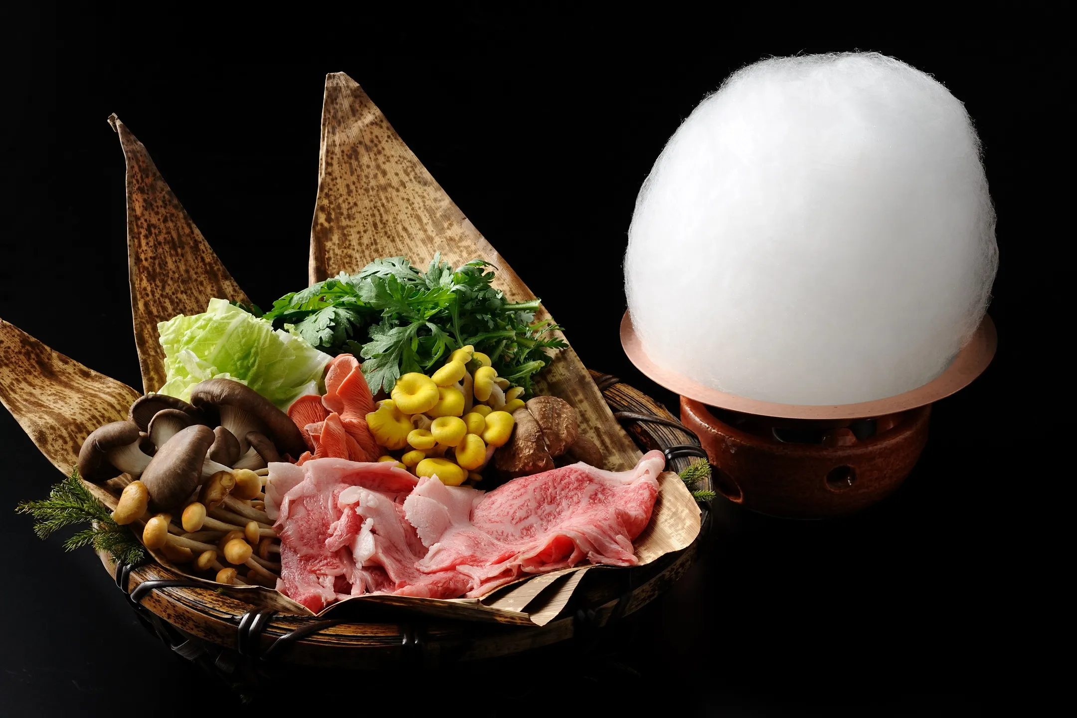 アルプスの山々の雪に見立てたふわふわの綿あめをのせた「雪鍋」。割下をかけると、まるで春の雪解けのように綿あめがすっと溶けて、牛肉と野菜が顔を出します。綿あめのまろやかな甘みをまとった、目でも舌でも楽しめる鍋です。