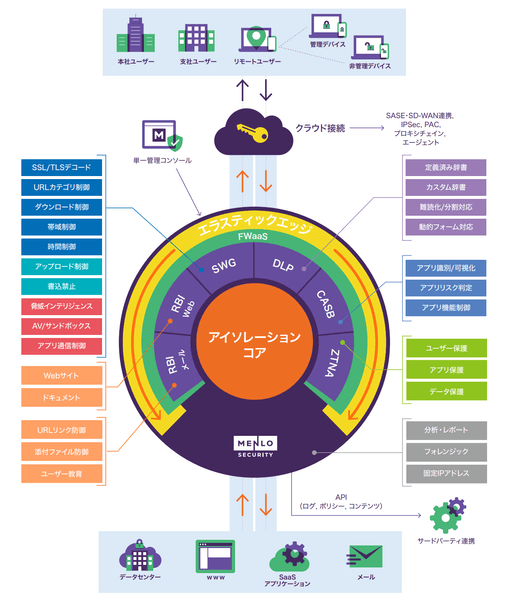・アイソレーションコア(RBI)を中心としたMenlo Securityの提供機能イメージ