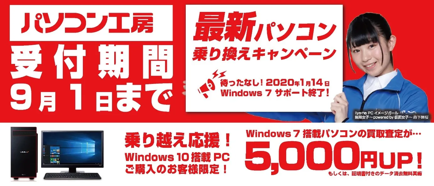 パソコン工房・グッドウィルを運営する株式会社ユニットコム(代表取締役:端田 泰三、本社:大阪市浪速区)は、全国のパソコン工房・グッドウィルの店舗、インターネット通販、法人営業部にて、2019年9月1日(日)までの期間限定で、Windows 7からWindows 10への乗り換えの際、Windows 7搭載パソコンの買取査定が5,000円増額、または、証明書付きのデータ消去サービスが無料となる下取りキャンペーン『最新パソコン乗り換えキャンペーン』を開始いたします。