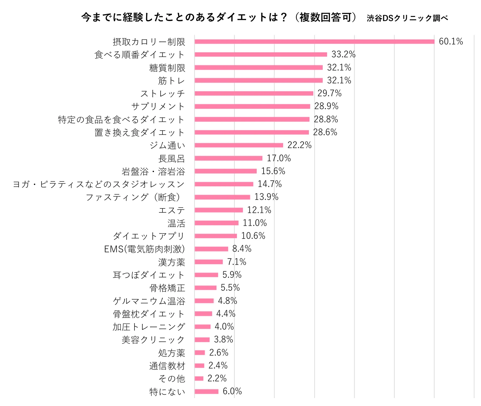 渋谷DSクリニックが行なった調査(※)によると、ダイエット経験のあるアラサー・アラフォー(25~45歳)に「今までに経験したことのあるダイエット」(複数回答可)を尋ねたところ、最も多かった回答が60.1%で「摂取カロリー制限」、次いで「食べる順番ダイエット」33.2%、「糖質制限」32.1%、「筋トレ」32.1%と続きました。上位を見ると、食事・運動に関する取り組みが多くを占めています。