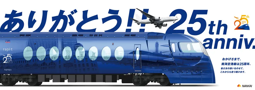 南海電気鉄道株式会社(社長:遠北 光彦)における空港線は今年で開業から25周年を迎えることができました。そこで、皆さまのご利用に対する感謝とますますの発展を記念して「ありがとう!!25th anniv.」と銘打ち、さまざまなイベントを開催いたします。