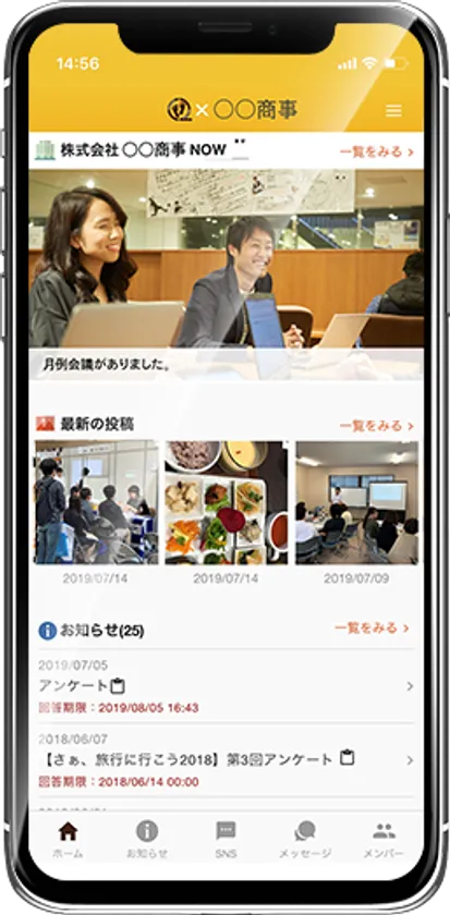 ホームページや合同企業説明会で伝えられない会社の雰囲気や魅力や先輩社員の働きをリアルに伝えることができるクローズド(招待制)SNSスマホアプリです。
