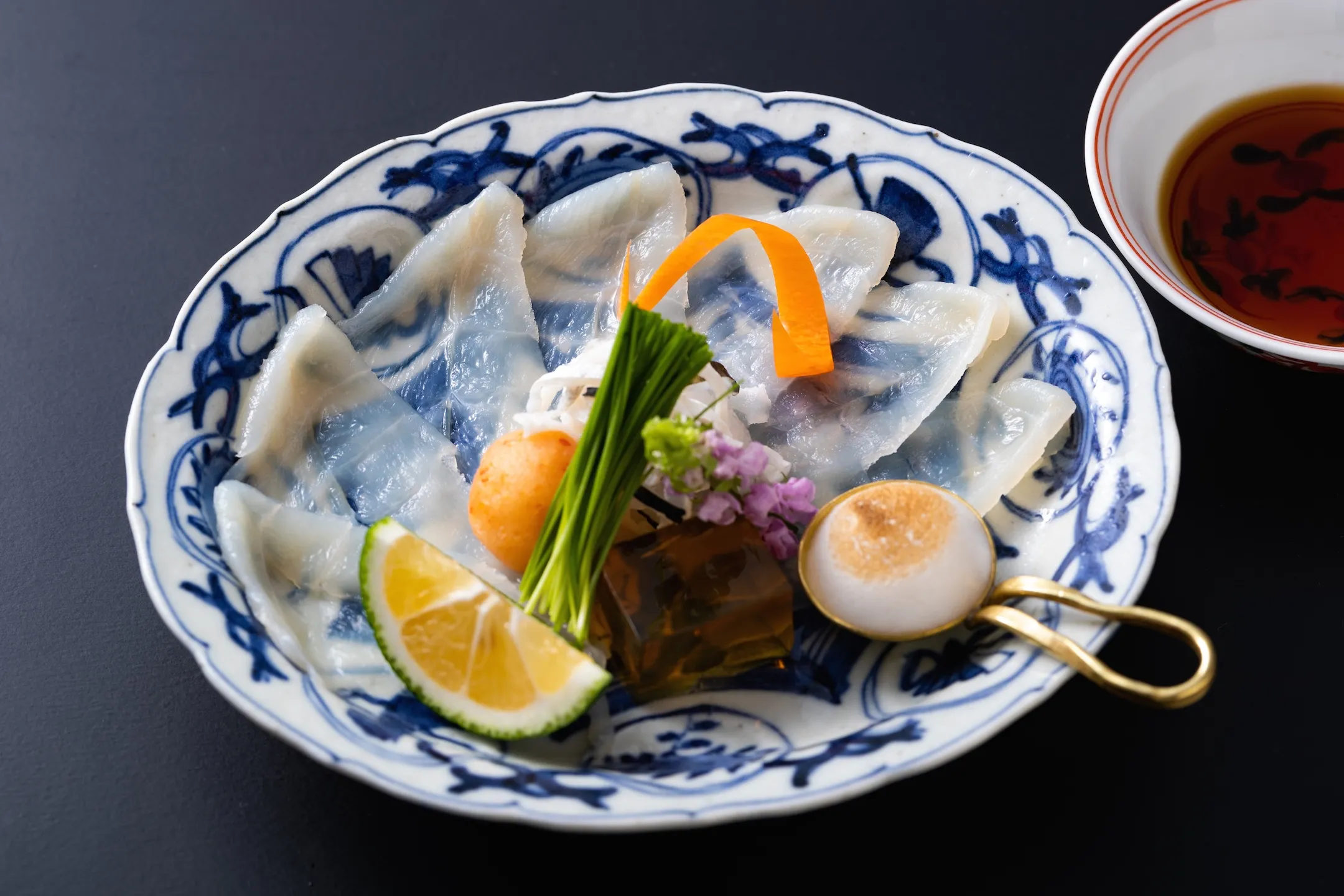 向附は河豚の刺身「てっさ」です。冬の定番である河豚鍋「てっちり」の要素を加えることで、その温かさを想起させるような仕立てにしています。刺身は、焼いた河豚のあらと、金時人参、白葱、白菜といったてっちりで使われる食材から取った出汁の煮凝り(にこごり)、ポン酢で味わいます。また、煮凝りと同じ出汁を使って仕立てた焼き白子のムースは、そのままでも刺身と合わせても楽しめます。焼き白子のムースのコクや煮凝りの旨みが、河豚の淡泊な味を引き立てます。