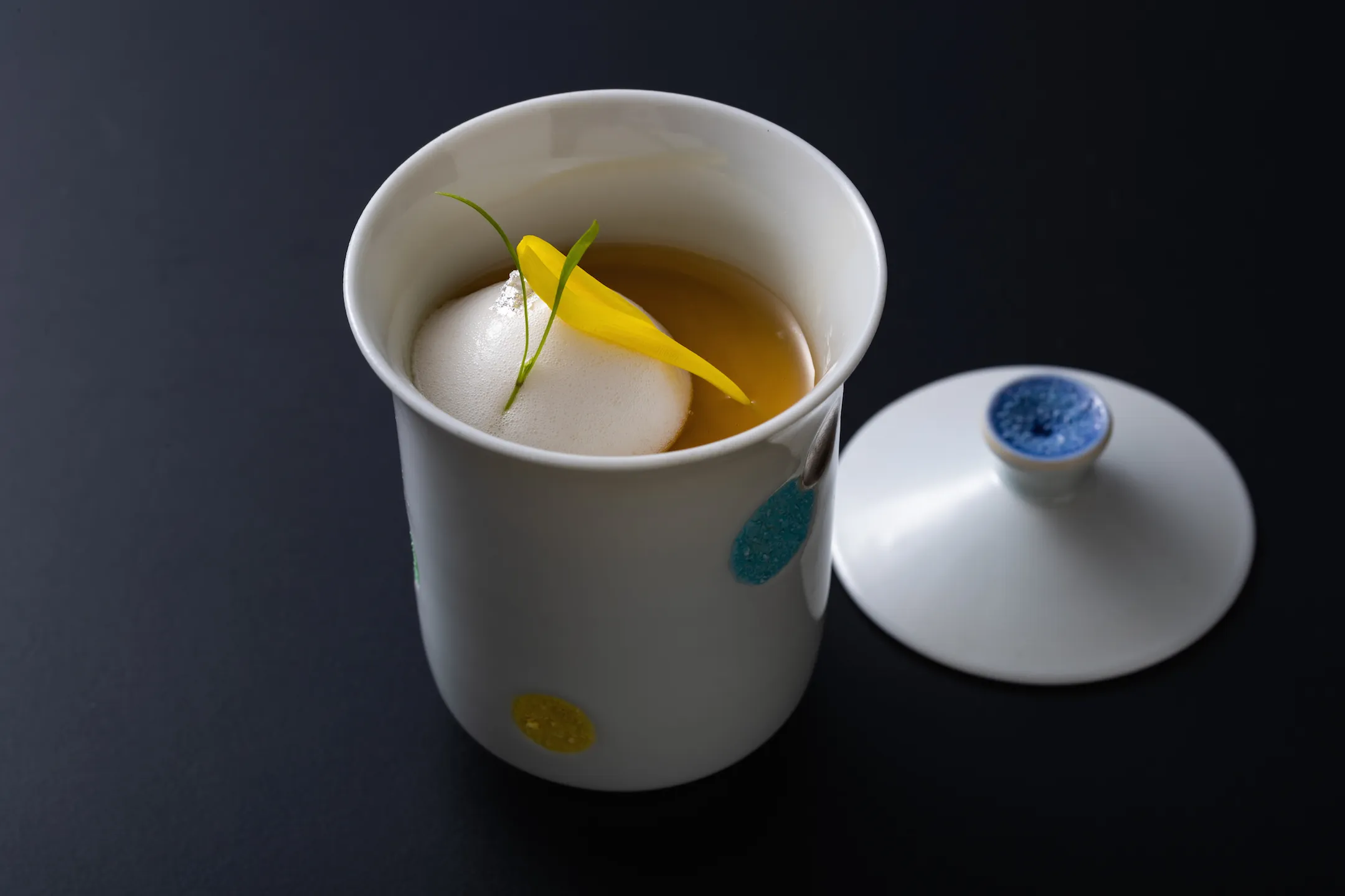 器は、京焼の窯元である叶松谷氏の次男・具夫氏が、料理長久保田と共に考案し「白磁彩色水玉模様吸物(はくじさいしょくみずたまもようすいもの)」と名付けました。水玉模様は、桃山期のスペインやポルトガルの交易により日本にもたらされ、江戸初期に革新の代名詞として盛んになったデザインです。具夫氏も久保田も老舗の窯元や割烹で産まれたのち、その伝統を守りながらも、独自の感性で現代に合わせたアレンジを提案してきました。この器には、京焼や京料理の次世代を担っていくという二人の想いが込められています。