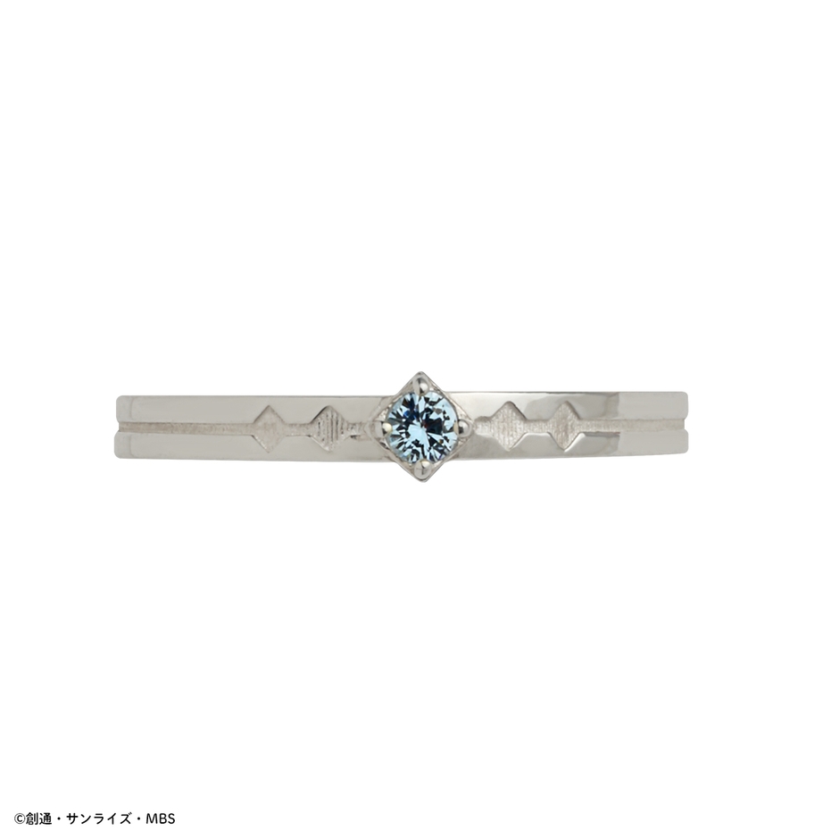 『機動戦士ガンダム 水星の魔女』のミオリネ・レンブランをイメージしたシルバーリングです。着用しているタイツのラインとブーツをモチーフとして取り込み、イメージカラーストーンをセット。内側にはパーソナルマークと愛称の刻印を施しました。
