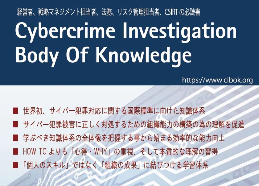 CIBOKは、サイバー犯罪及びその調査・捜査における組織の組成及び技術、手法、工程、手続きなどに関する知識を包括的・体系的に整理したものを「公共知財」と位置づけたもので、その普及・活用によるサイバー犯罪への対応能力向上を支える世界共通のフレームワークとして役立てて頂くことを目指すものとして2017年4月に米国ワシントンD.C.の商工会議所において正式に第1版をリリースしました。なお、書籍は公式サイト( https://www.cibok.org/ja/ )より購入可能です。