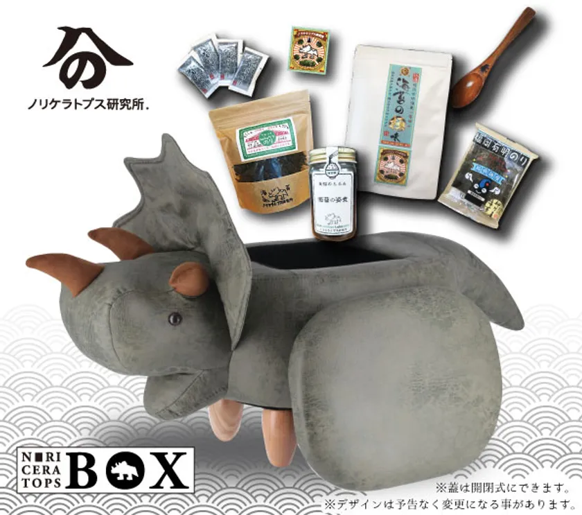 由来のトリケラトプスをBOXにした、ノリケラトプス研究所.ブランドと福岡有明のりブランドの高級海苔ギフトを限定で50セット販売販売します。