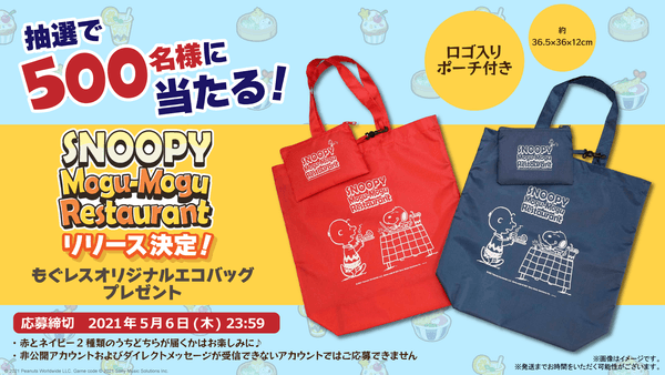 「SNOOPY Mogu-Mogu Restaurant」のリリースを記念し、もぐレスオリジナルエコバッグを抽選で500名様にプレゼントいたします。公式Twitterアカウント(@snoopy_mogures)をフォローして、該当ツイートをリツイートすることでご参加いただけます。詳細は公式Twitterをご確認ください。