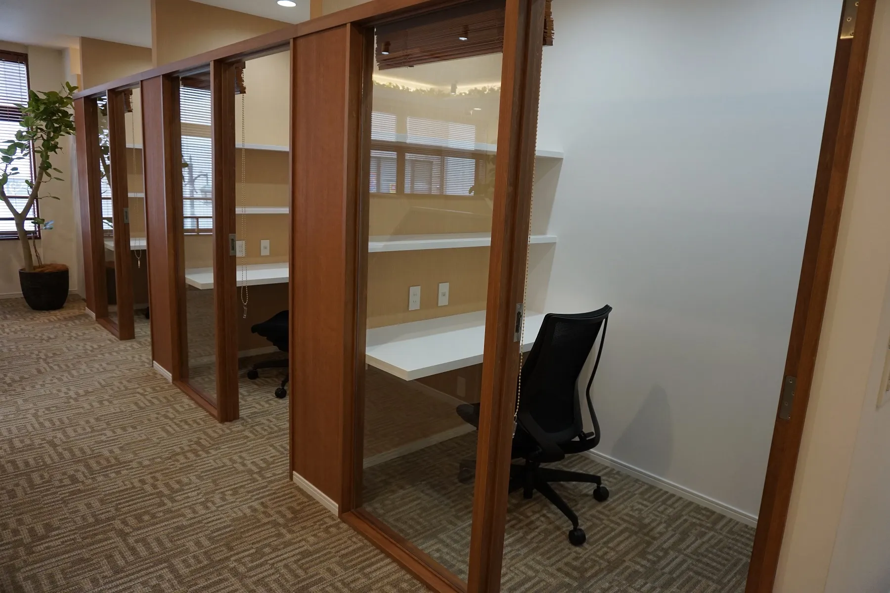 11の専用個室の他、フリーデスク、会議室などの様々なワークスペースから、チームミーティングや遠隔地とのネット会議などテレワークに対応するサービス・設備をご用意しております。月極利用の他、スポットでのご利用、アフタースクールなしのご利用も可能です。
