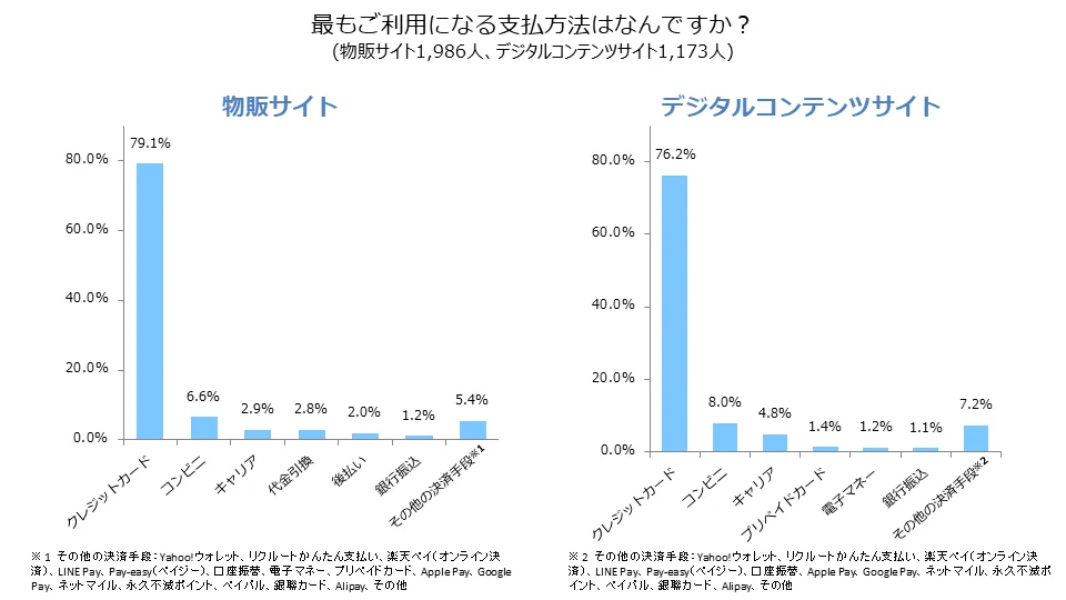ECサイトで最も利用する決済手段は、クレジットカード決済、次いでコンビニ決済。物販サイトでクレジットカード決済が79.1%、コンビニ決済が6.6%