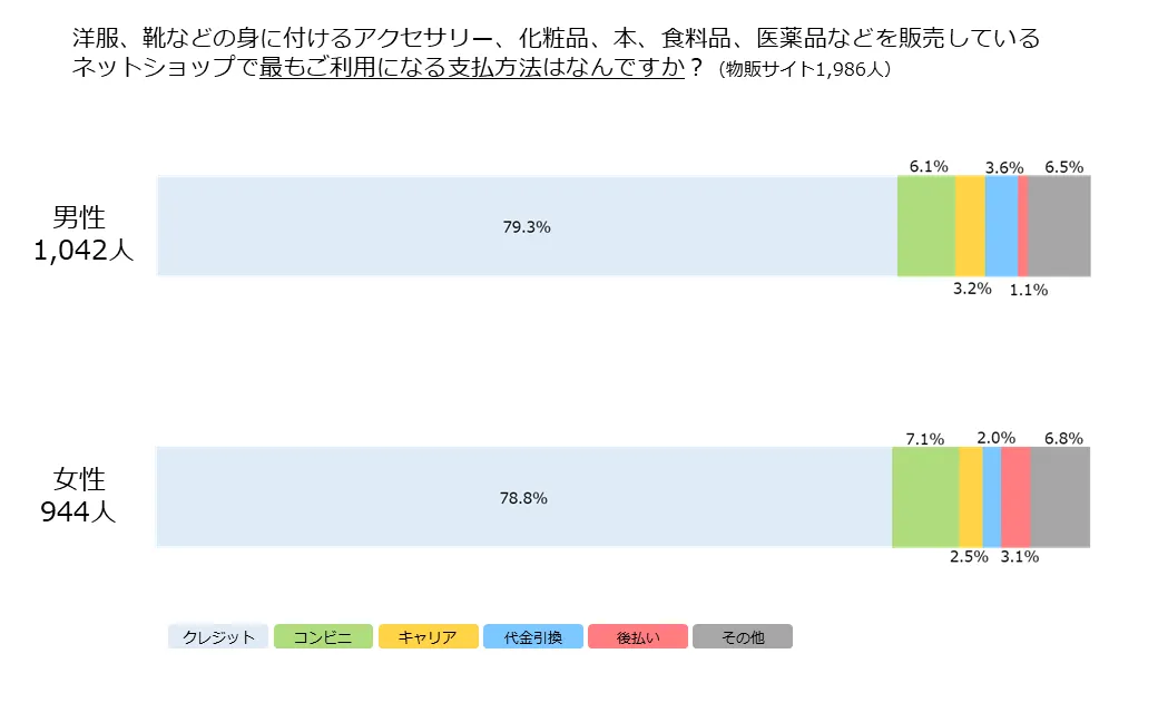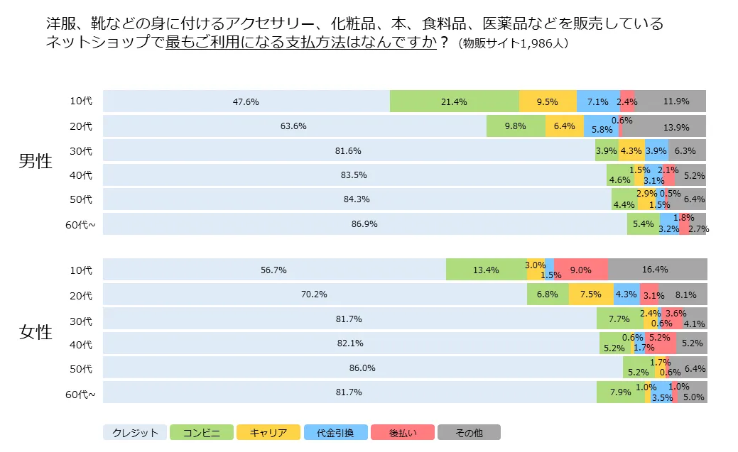 物販サイトではクレジットカード決済、コンビニ決済に次いで、男性は「代引き」を、女性は「後払い」を選択する傾向にある