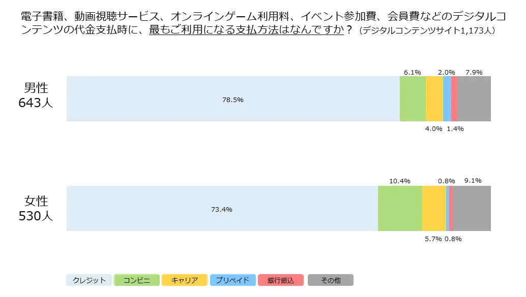 デジタルコンテンツサイトでは、女性は男性と比べクレジットカード決済以外の決済手段の割合も高く10.4%がコンビニ決済を、5.7%がキャリア決済を選択