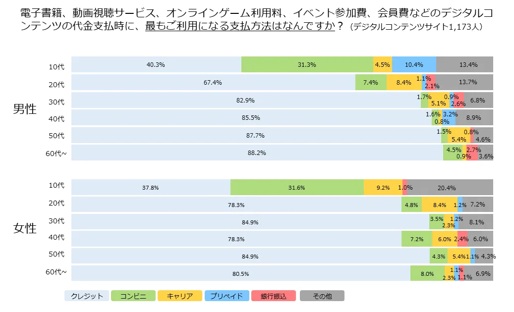 デジタルコンテンツサイトでの10代のコンビニ決済利用率は男女ともに30%超え、10代男性の10.4%がプリペイドカード決済を利用