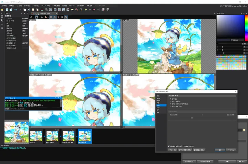 ETC1/ETC2、ASTC、PVRTC、RGBA4444などのスマートフォンアプリで使われるテクスチャ形式への変換・保存に対応しています。マクロ処理の保存形式をテクスチャ形式にすれば、最適化からテクスチャ変換までをOPTPiX ImageStudio 8だけで完結させることができます。