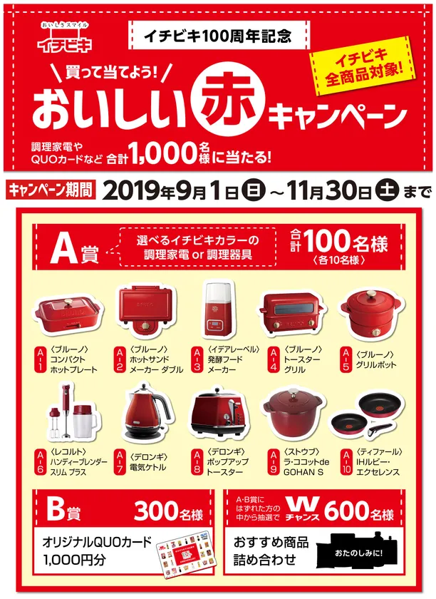 イチビキ株式会社(本社:愛知県名古屋市、代表取締役社長:中村光一郎)は、1919年に前身である大津屋株式会社(1961年にイチビキ株式会社に社名変更)を設立してから、2019年4月で100周年を迎えました。100周年を記念して、9月1日(日)から11月30日(土)まで、イチビキ商品1品以上を含む合計1,000円以上のお買い上げレシートでご応募すると、イチビキカラーの『赤』にこだわった調理家電・調理器具などが当たるクローズドキャンペーンを行います。