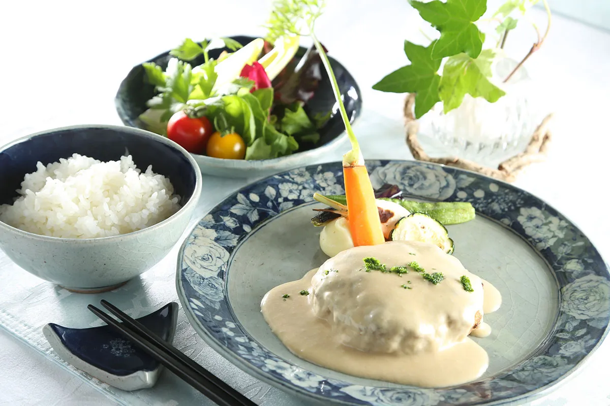ハンバーグランチを有田焼の器でご提供。※平日のみ・数量限定。作陶展期間中はお休みいたします。