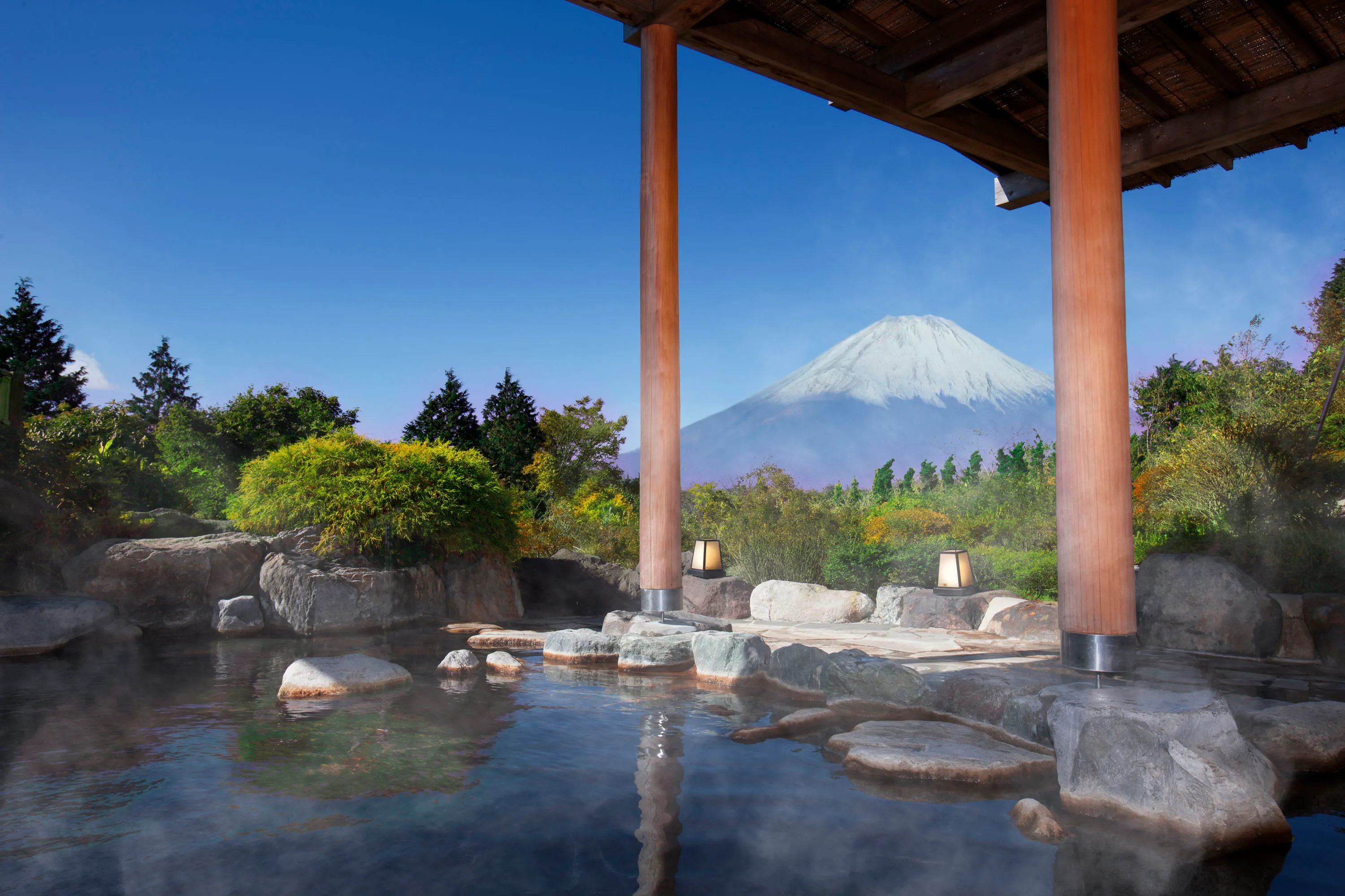 箱根仙石原の高台に位置しており、露天風呂からは男女共に湯船に浸かりながら富士山の絶景を望むロケーションです。箱根十七湯のひとつに数えられる仙石原温泉を自家源泉で存分にご堪能いただけます。