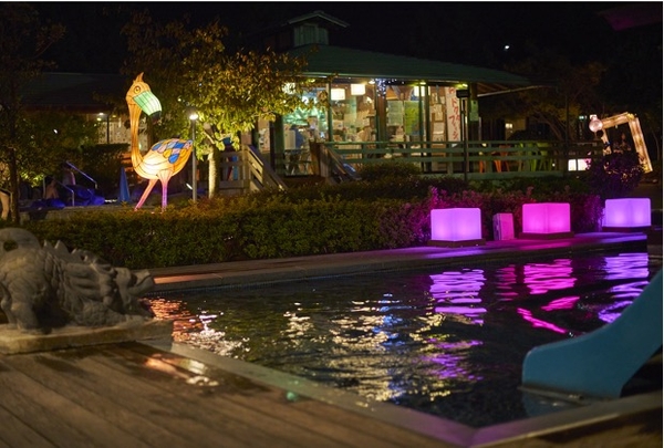 小さな滑り台でお風呂にダイブできる、お子様に一番人気のお風呂「亜細亜の湯」も冬季限定バージョンでライトアップ。「夜の滑り台」もなかなかできない経験?