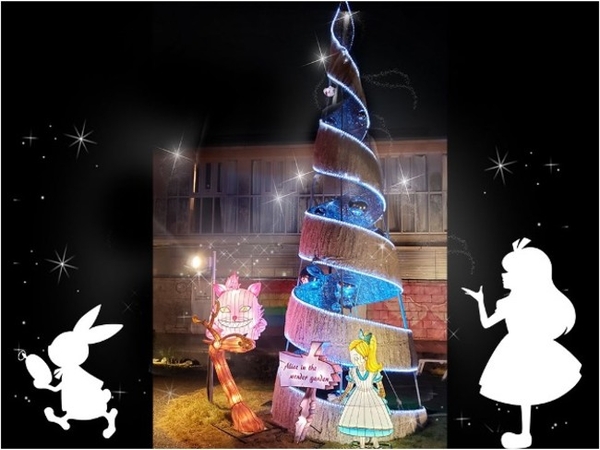 ベルギー製のデザインツリーや、アリスやその仲間たちと一緒に写真が撮れるフォトスポットがお客様をお迎えします。