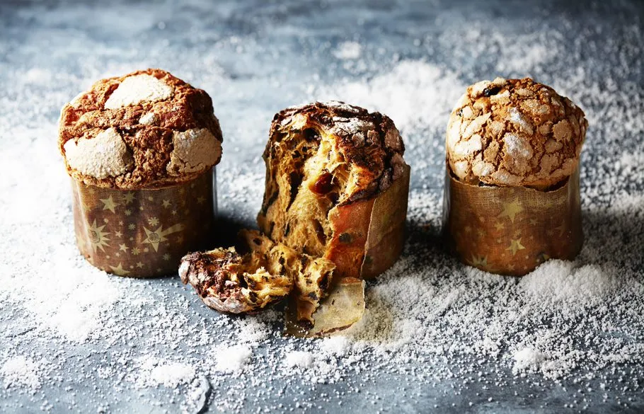 左:パネトーネ クラシコ、中央:チョコレートとチェリーのパネトーネ、右:栗とカシスのパネトーネ