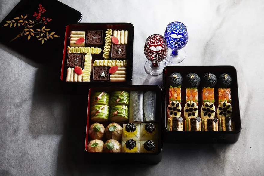 当館の副総料理長のニコラ ブジェマと、エグゼクティブ ペストリーシェフ ステファン トランシェが創作した、マンダリン オリエンタル 東京のプレミアムなフレンチおせちです。フランス料理のクラシックなレシピを完全に再現したシェフ ニコラのスペシャリテであるパテ、古典的フランス料理「オマール海老のア・ラ・ネヴァ」、カルダモンとヨーグルトを使いさっぱりと仕上げた京人参のテリーヌ、フランス風トリュフの伊達巻など、伝統的なフランス料理の調理法でおせちを作り上げました。宮内庁御用達の漆器店「山田平安堂」の三段重箱、江戸切子の老舗「華硝」による当館オリジナルで創る、ワイングラス(高さ10cm、赤と青各一個)と共に、素敵な新年をお迎えください。