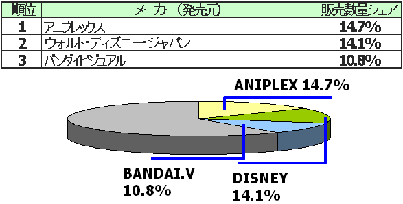 アニメ部門は、市場を二分するジャンルのひとつである邦アニメを手掛けるメーカーが優勢となった。トップシェアは「ヱヴァンゲリヲン新劇場版:破」でBlu-rayソフト史上最高の売上を記録したキングレコード。2位は幅広いTVシリーズラインナップを誇るアニプレックス、3位にはバンダイビジュアルが続いた。