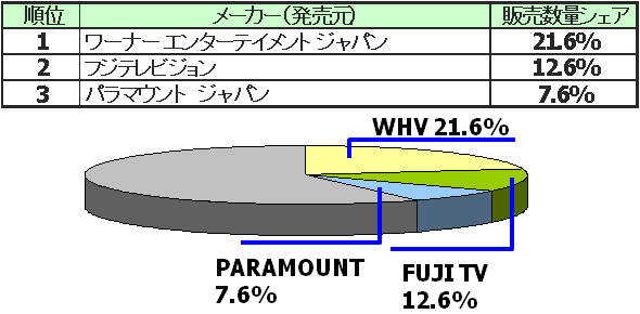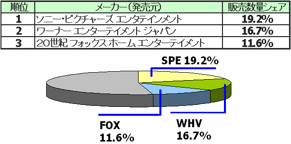 映画部門トップシェアはワーナー エンターテイメント ジャパン。新作のコンボパックを積極的に市場投入したことが奏功した。Blu-rayソフト単体ではヱヴァンゲリヲンに続く売上を記録した「マイケル・ジャクソン THIS IS IT」を持つソニー・ピクチャーズ エンタテインメントが2位、「アバター」等の新作のほか、旧作のBlu-ray化も積極的に手掛けた20世紀フォックス ホーム エンターテイメントが3位という結果となった。
