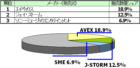 洋画、邦アニメに並ぶ主力ジャンルである音楽部門は、EXILEや東方神起、安室奈美恵等、多彩なアーティストの作品を抱えるエイベックスがトップに立った。2位には国民的アイドルに成長した嵐の作品が好調なジェイ・ストームが位置づけ、3位にはソニーミュージックエンタテインメントが続いた。