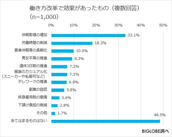 また「働き方改革で効果があったもの」を質問すると、「休暇取得の増加」(33.1%)、「労働時間の削減」(18.3%)が上位に。