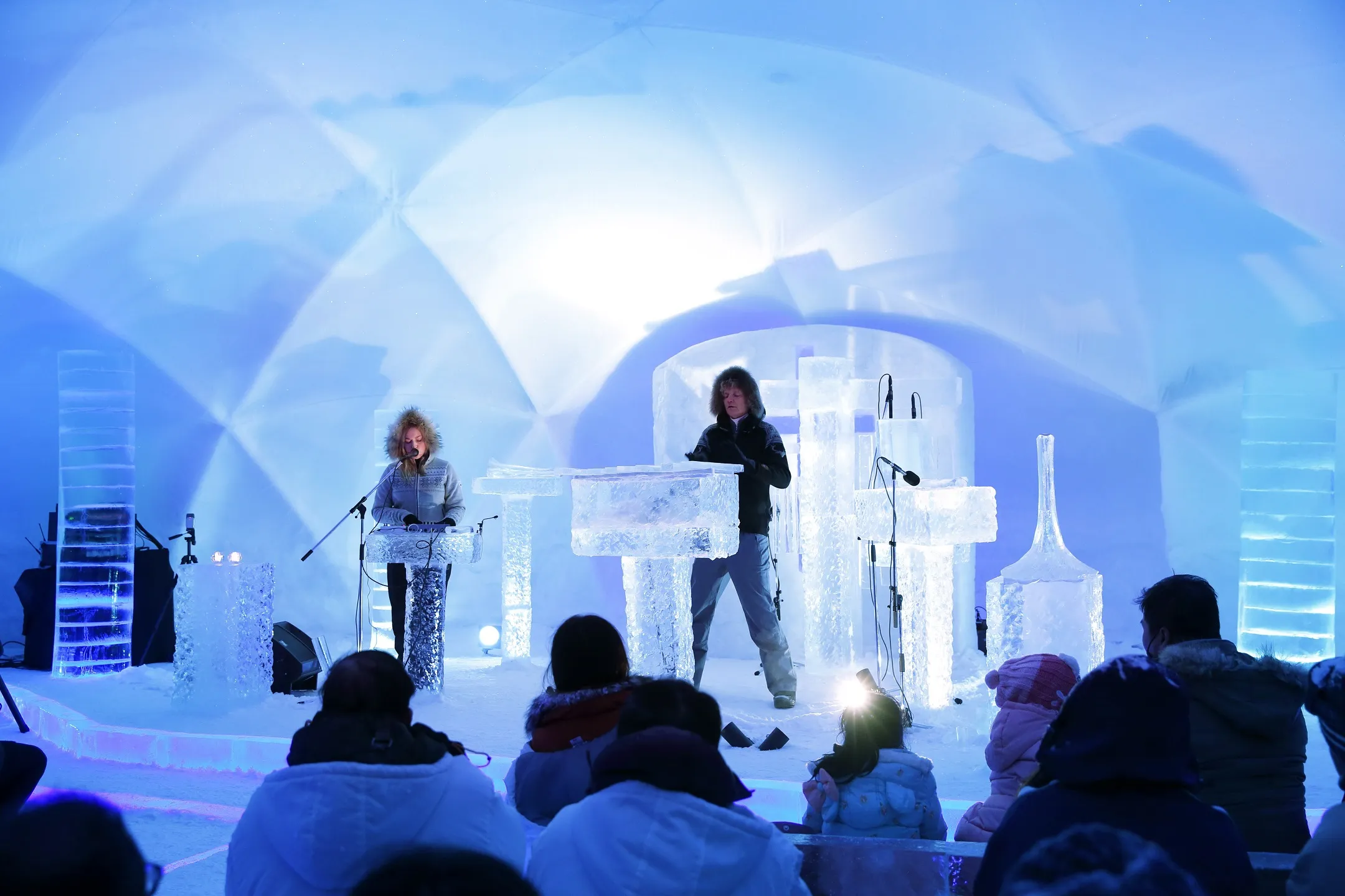 「氷の楽器屋」では、氷でできた楽器を見学、演奏できます。この楽器屋は、氷の楽器を見学するエリアと演奏できるエリアに分かれています。演奏を体験できるエリアでは、氷の楽器を実際に叩いたり擦ったりして音色を楽しめる空間です。また、2020年2月17日の「天使のささやきの日」(*1)には、氷の楽器を使って演奏する「氷のコンサート」を開催します。5回目となる今回は、ノルウェー出身の氷のミュージシャン「Terje Isungset(テリエ・イースングセット)」氏が演奏します。
